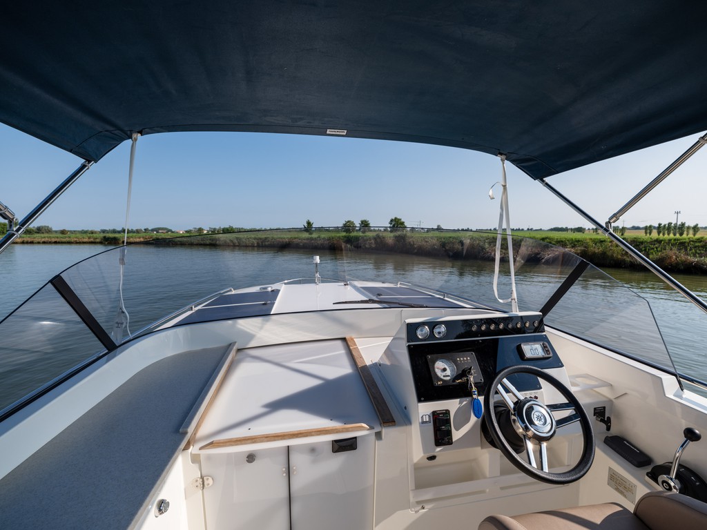 La barca è dotata di 2 posti di guida, uno sul terrazzo, ed uno, di emergenza, interno e coperto.