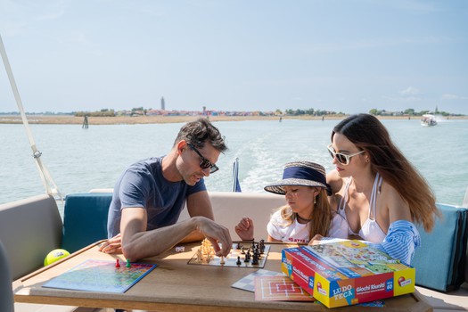 Quando si sosta in porto la barca può essere collegata alla rete elettrica tramite un cavo fornito in dotazione. Si può collegare il proprio smartphone alla Radio Wi-FI e così facendo si può ascoltare la propria musica all’interno della sala.