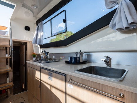 Il salone centrale ospita la cucina, oltre agli ampi divani a ferro di cavallo. Sono presenti numerosi spazi per stoccare il cibo ed i propri effetti personali. La cucina è equipaggiata con tutto ciò che serve alla vita di bordo, incluso un frigorifero per 4 persone (più basso rispetto ad un normale frigorifero domestico). La cucina è alimentata da una bombola di gas fornita in dotazione.