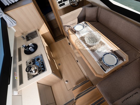 La dinette è pienamente illuminata da ampie vetrate panoramiche che la avvolgono, garantendo una esperienza immersiva di vita di bordo.